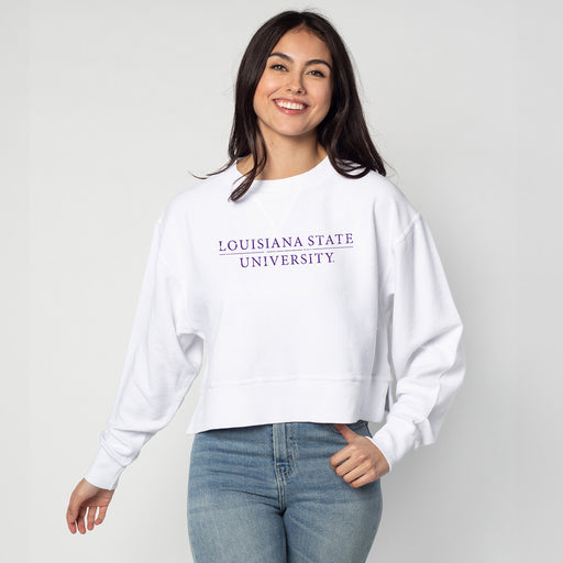 Show your LSU Tigers spirit with this playful varsity-style cropped T-shirt. Perfect for outdoor activities or cheering on your team in Baton Rouge...