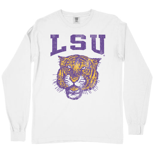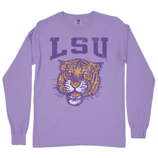 Represent the Tigers in style with our LSU Tigers Mascot Overlay Garment Dyed Long Sleeve T-Shirt. Printed on a Comfort Color long sleeve tee const...