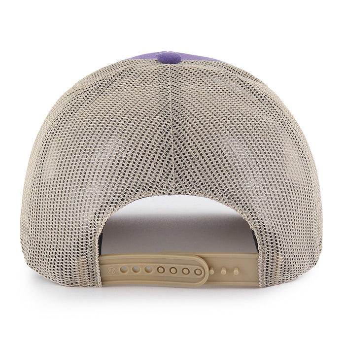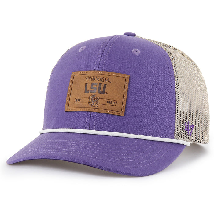 Our LSU Tigers 47 Trundle Patch Rope Mesh Trucker Hat from 47 Brand has tons of style with a vintage look. This five-panel cap features a lightly structured crown, pre-curved bill and a sewn on leather patch. The a plastic snap closure and a braided nylon rope along the visor makes for a complete throwback look. Made from garment washed cotton twill front and polyester mesh back.