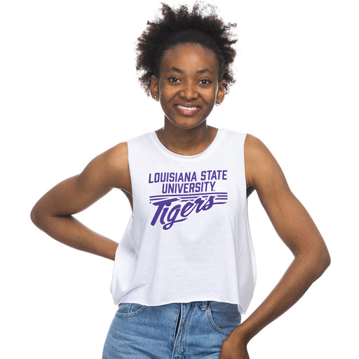 Celebrate your LSU pride with the LSU Tigers ZooZatZ Women's 1st Down Crop Tank in white. Featuring inspired design elements that honor the vibr...