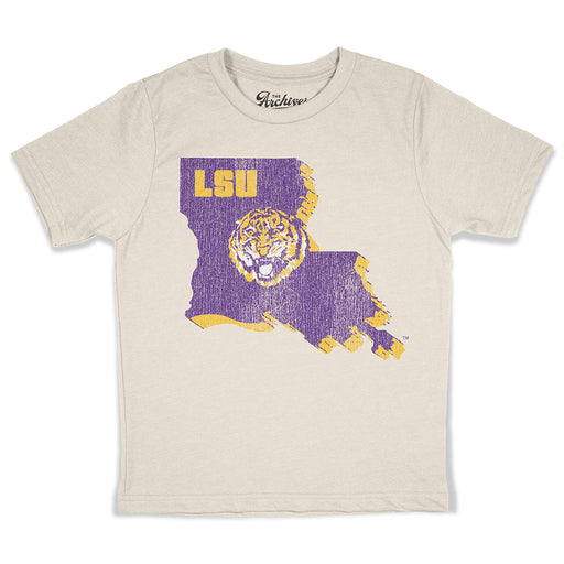 Celebrate your LSU Tigers pride with this Wes & Willy Round Vault Arch Colorblock Yoke Applique Stripe T-Shirt in natural. Featuring a soft, r...