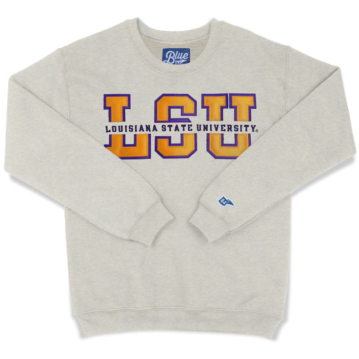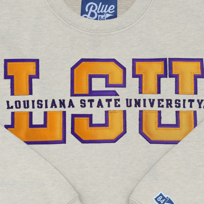 LSU Tigers Blue 84 Top Level Split Applique Fleece Crewneck Sweatshirt - Oatmeal
