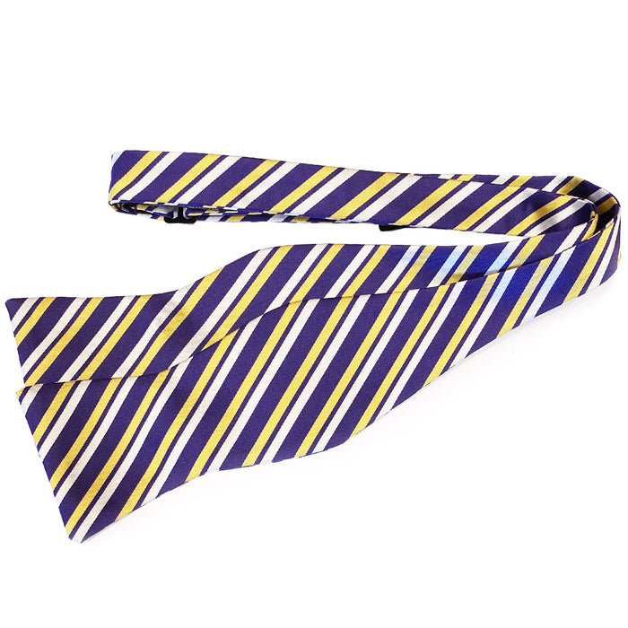 Add a touch of purple + gold pride to your next event with our B&B Dry Goods woven hand tied bow ties. Featuring a woven thin stripe pattern on a modern stye adjustable bow tie