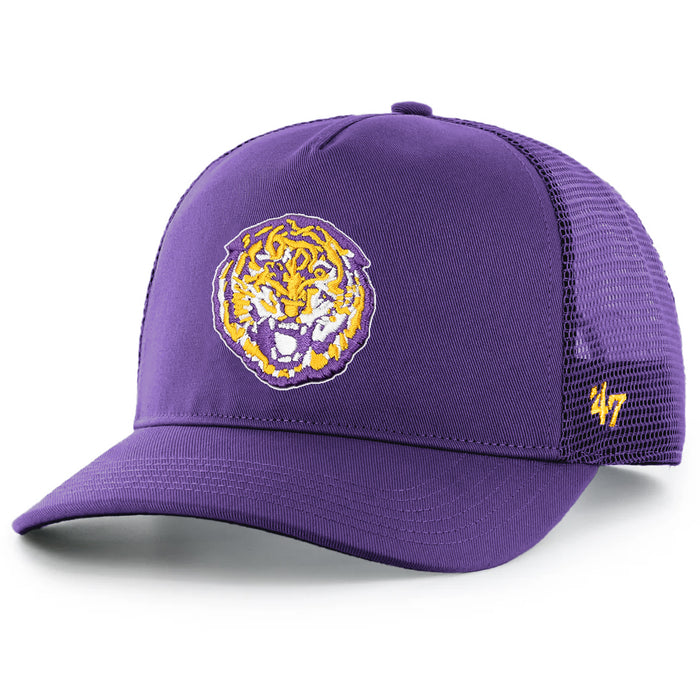 Our LSU Tigers 47 Round Vault Hitch Mesh Trucker Hat from 47 Brand has tons of style with a vintage look. This five-panel cap features a lightly structured crown, pre-curved bill and raised embroidery. Made from garment washed cotton twill front and polyester mesh back.