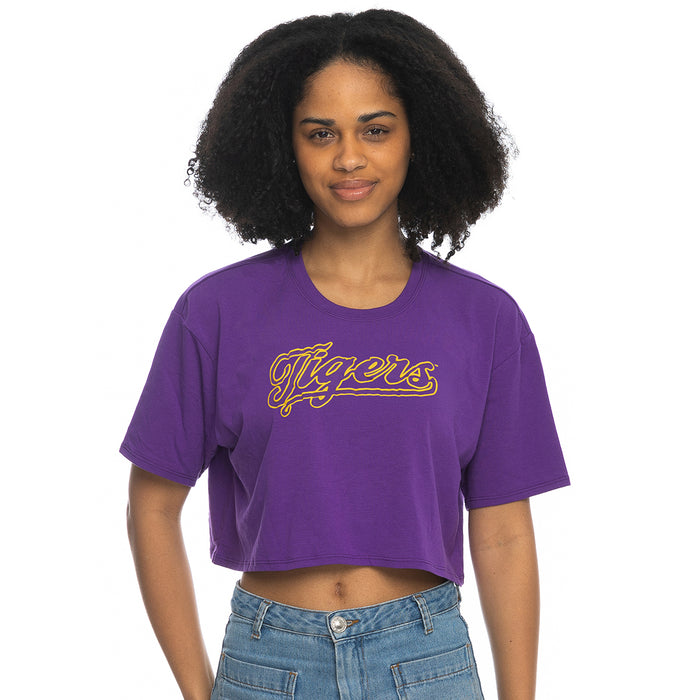 LSU Tigers ZooZatZ Women's Tigers Script Puff Ink Boxy Crop T-Shirt - Purple